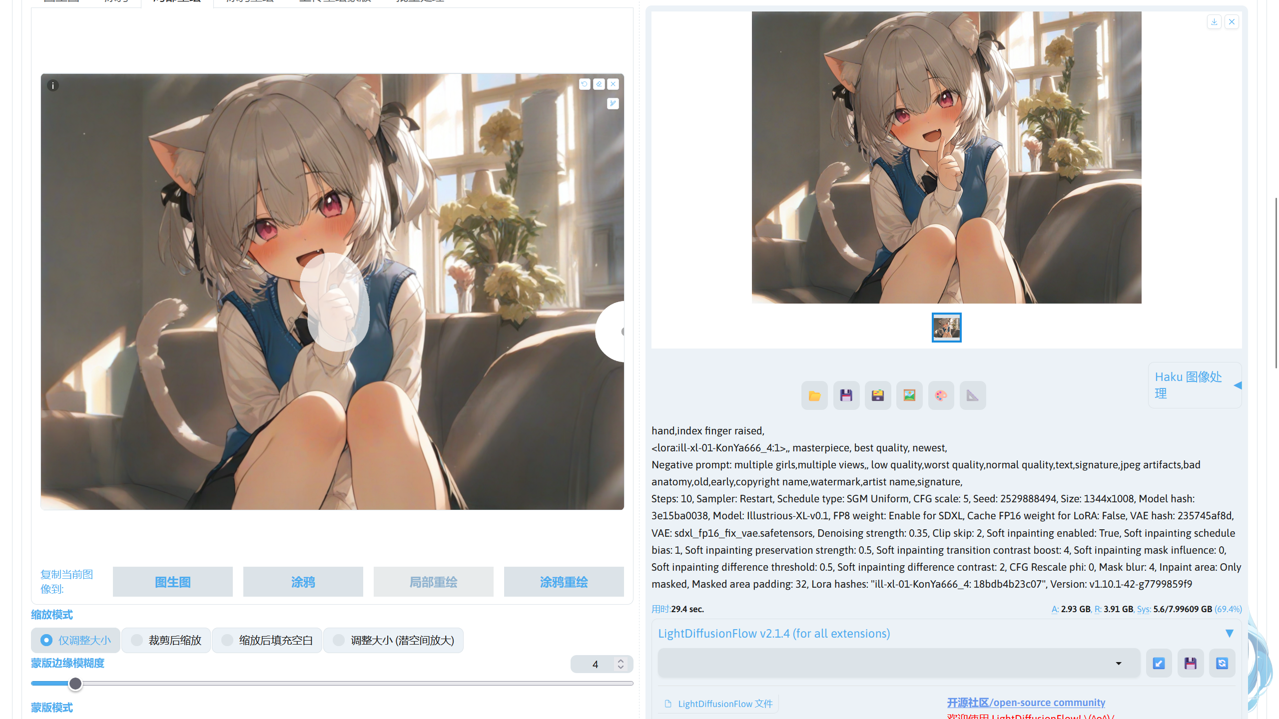 图生图需要将原图反推为潜空间数据,因此占用会比文生图更高,并且参考图尺寸越大占用越高。对于局部重绘,占用会比单纯图生图再略高,但这并不意味着低显存就不能局部重绘,实际上只要采用将重绘区域裁剪下来的方法就可以实现低显存重绘。并且由于图生图会经过两次 VAE,在使用 VAE 异常的模型时,每次重绘都会导致画面变得更灰,反复迭代将灰到不能看,最好保持外挂 VAE。